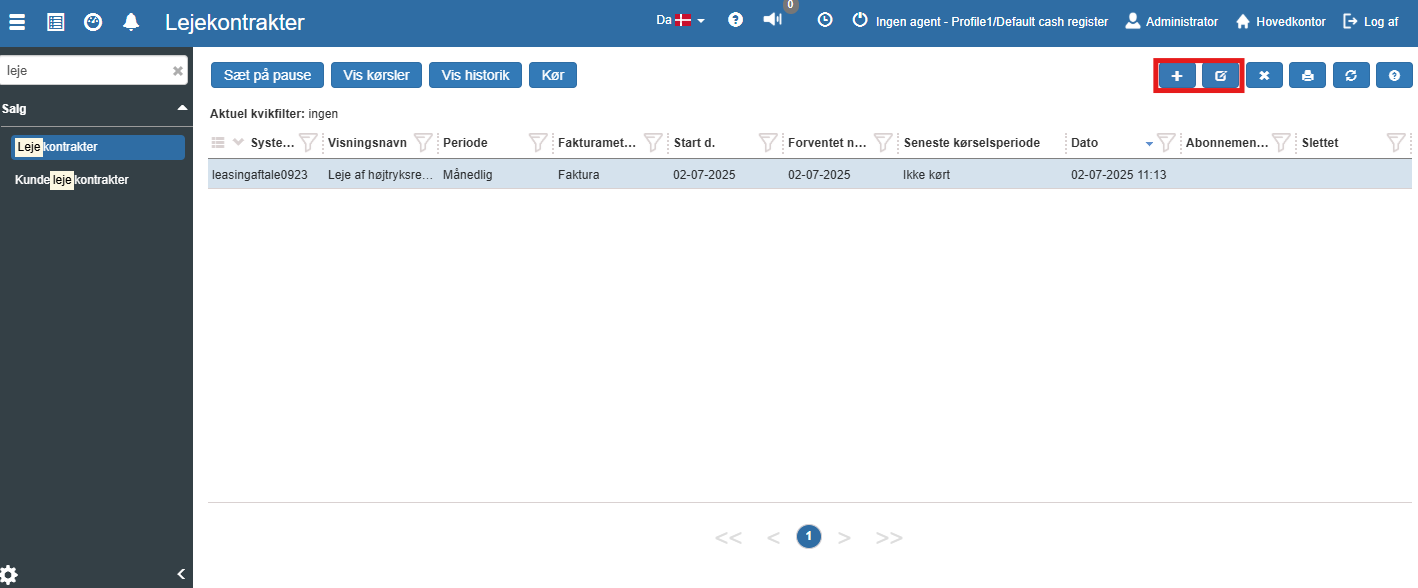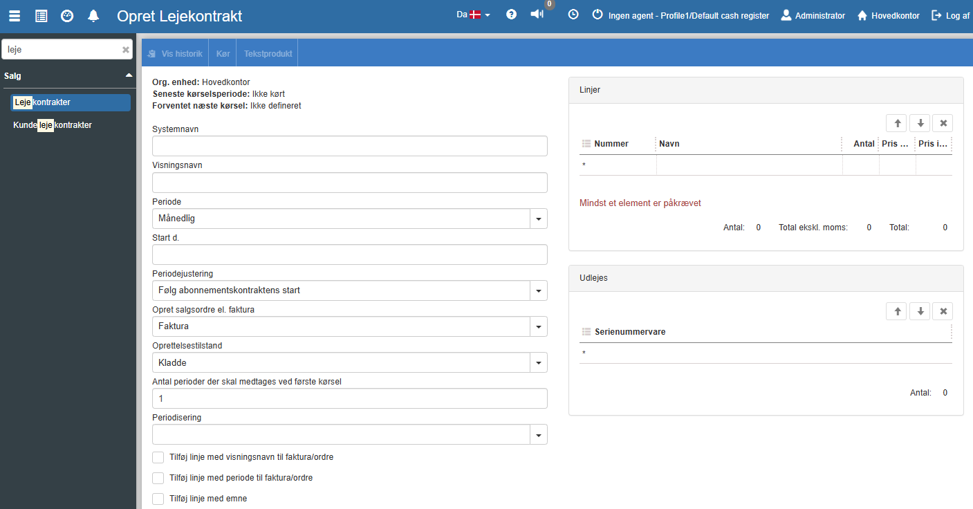 Næste kørsel: Her vises den næste periode, denne lejekontrakt vil bilve opkrævet for.
