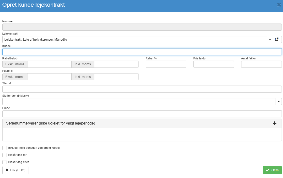 Kunde: Kan kun vælges ved oprettelse af en ny kundekontrakt. Her vælges den kunde, som lejekontrakten skal tildeles.