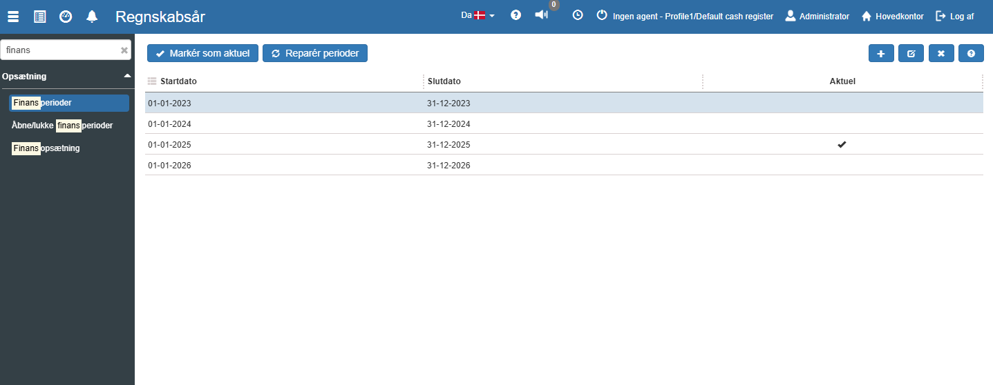 Perioderne vil aldrig påvirke de faktisk bogførte posteringer. Det er udelukkende et redskab til at styre fremtidige årsafslutninger, samt at give mulighed for at åbne og lukke perioder.