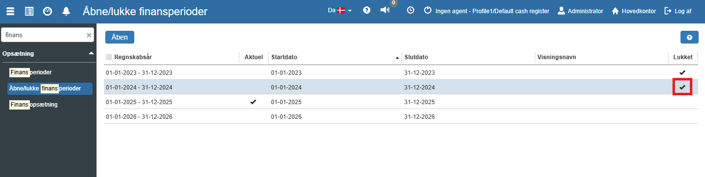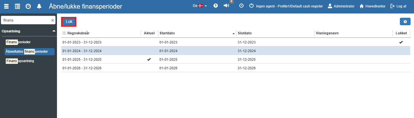 Du har nu lukket den ønskede finansperiode, hvilket ses markeret i kolonnen "Lukket".