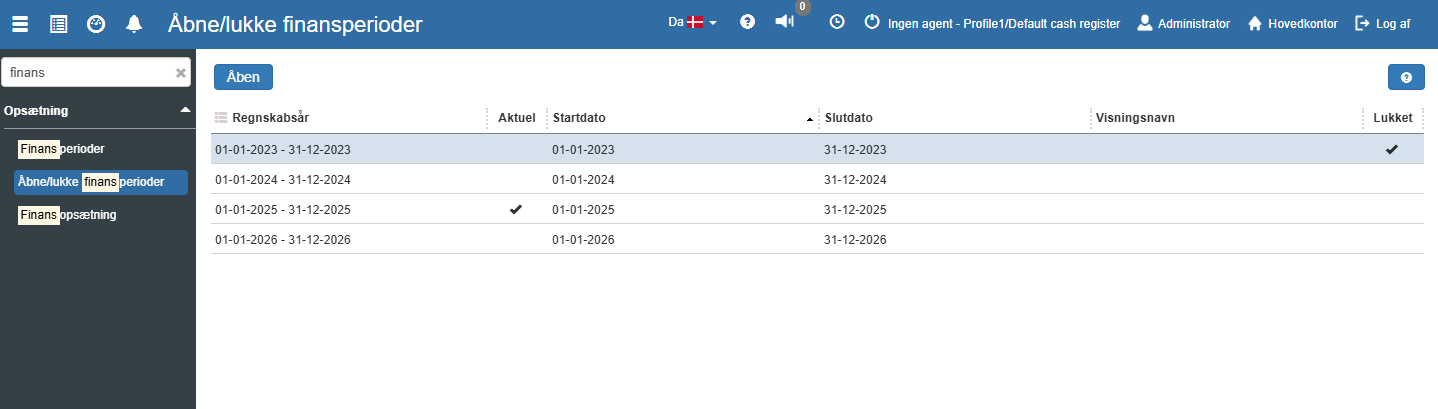Åben: Kun synlig, hvis perioden er lukket. Efter åbning kan der bogføres normalt på perioden igen (posteringskladden og automatisk genererede posteringer tillades i perioden).