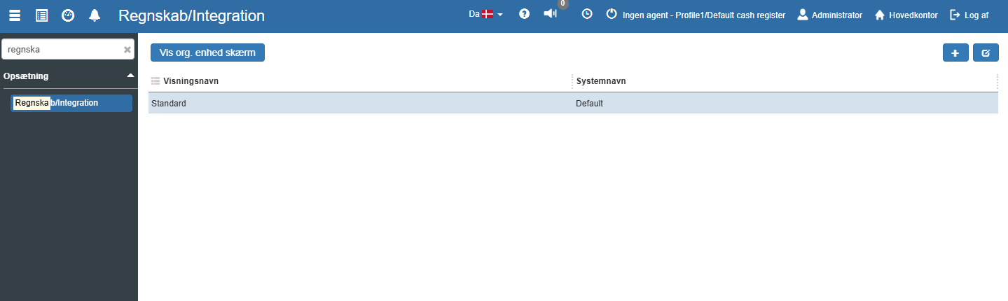 Øverst til venstre finder du en blå knap "Vis org. enhed skærm". Fra finansopsætning knyttes en org. enhed til et regnskab. Fra org. enheder kan man oprette stamdata oplysninger tilknyttet hver org. enhed. Knappen vis. org. enhed vil åbne den org. enhed som er tilknyttet dette regnskab. Det er herfra stamdata for dette regnskab vedligeholdes.