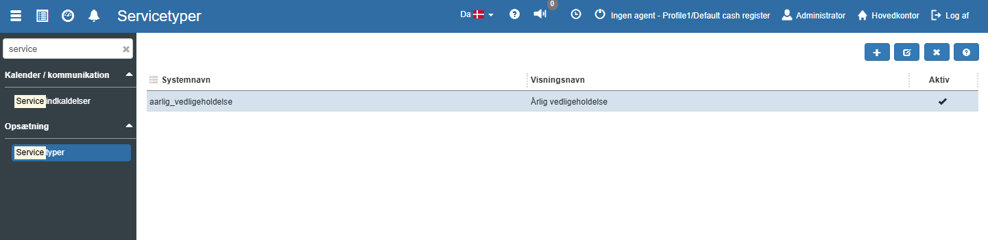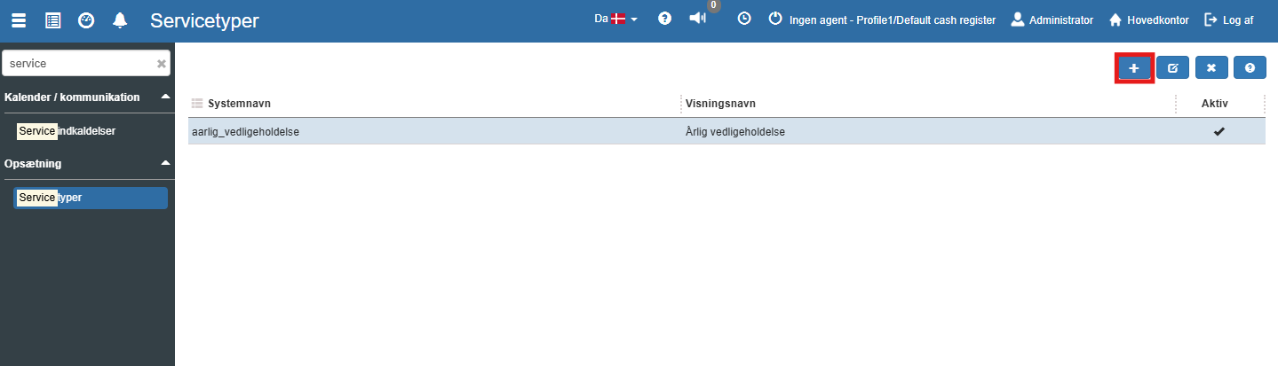 3. Du er nu på "Servicetyper"-fanen, hvor en oversigt over dine servicetyper i Sapera er synlige.