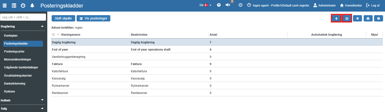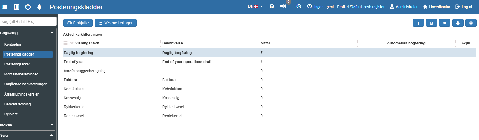 Fra denne oversigt kan du oprette/ændre de posteringskladder, der måtte være behov for. Ofte vil der findes en kladde for hver adskilt funktionalitet - købsfaktura, faktura, bankbetalinger osv., men det kan også være en kladde for hver bogholder.