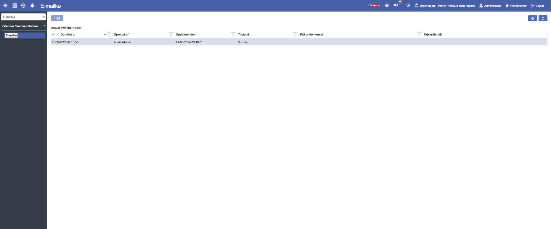 På siden "E-mailkø" finder du en samlet oversigt over dine udsendte emails i Sapera.