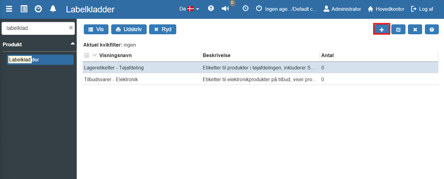 Ønsker du at oprette en ny labelkladde, kan dette nemt gøres med et klik på det blå "+" ikon øverst til højre: