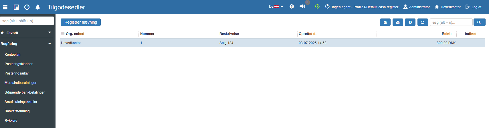 3. Du er nu på "Tilgodesedler"-fanen, hvor en oversigt over dine udstedte tilgodesedler i Sapera er synlige.