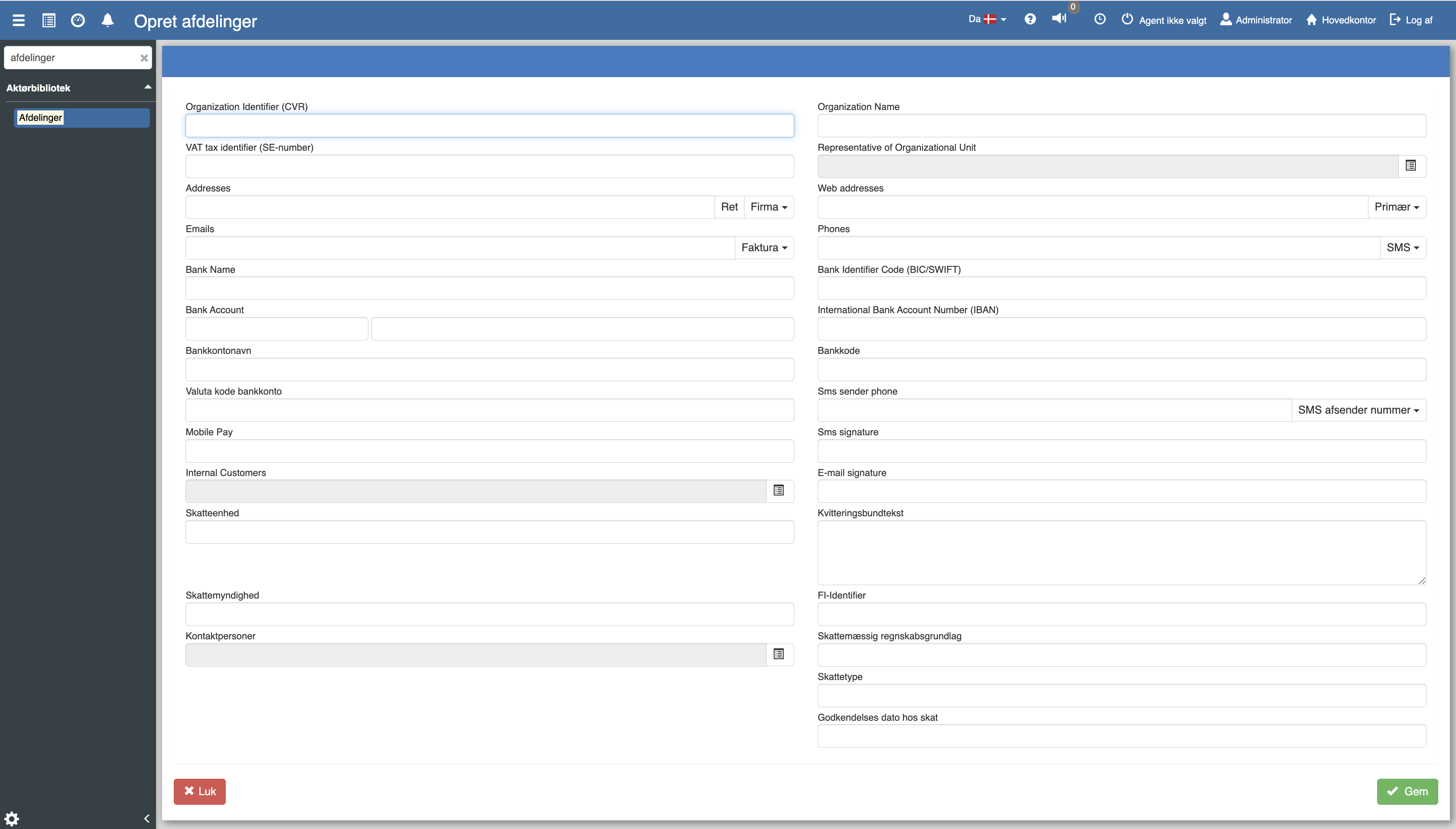 Følgende menu vil nu åbne sig, hvor du har mulighed for at oprette en ny afdeling: