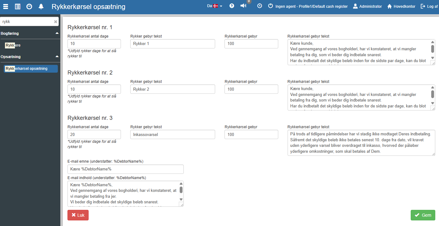 Når alle ændringer er gennemført, skal du klikke på Gem for at sikre, at opsætningen opdateres. Det er en god idé at teste opsætningen ved at simulere en rykker, så du kan sikre, at alt fungerer korrekt.