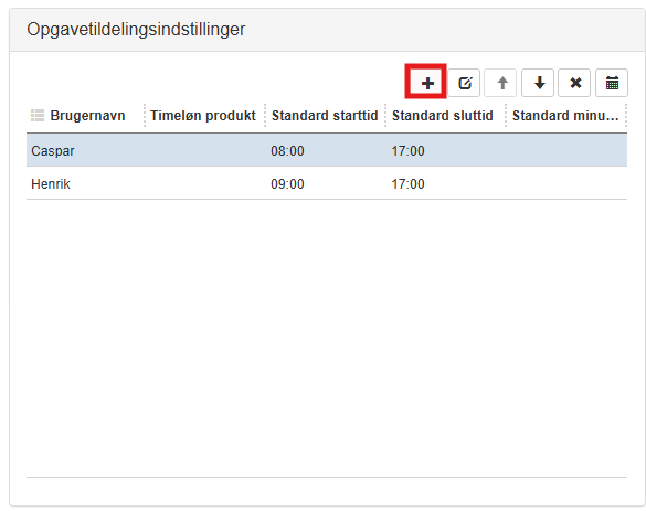 Opgavetildelingsindstillinger er en funktion i Sapera, der giver administratorer mulighed for at definere standardparametre for opgavefordeling til specifikke brugere. Disse indstillinger sikrer, at opgaver bliver tildelt korrekt og konsistent baseret på foruddefinerede parametre såsom tidsregistrering og daglige arbejdstider. Ønsker du at oprette en ny kan dette gøres ved at klikke på "+" ikonet:
