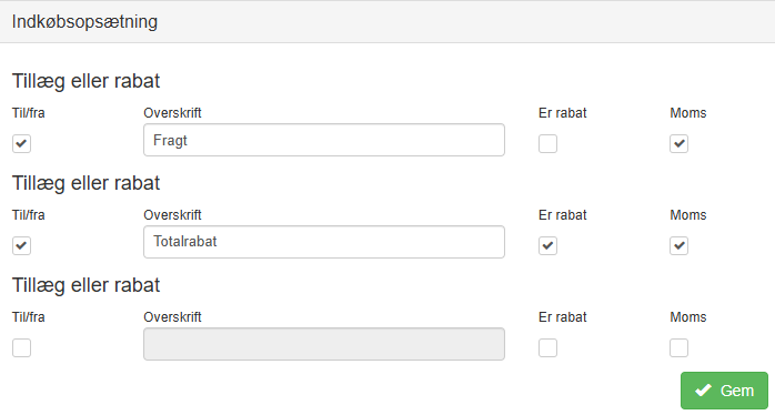 Indkøbsopsætningen gør det muligt at håndtere tillæg eller rabatter, som for eksempel fragt og samlede rabatter, der kan tildeles købsordrer. Her kan du også definere, om tillæg eller rabatter er momspligtige, samt om de skal klassificeres som rabatter.