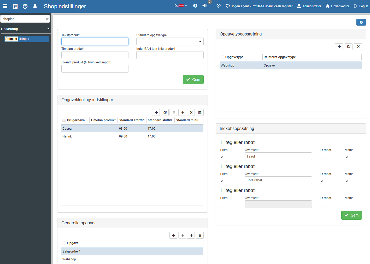 Ved hjælp af shopindstillinger kan du definere et standard tekstprodukt, som kan bruges til ordrer og fakturaer, hvor et fysisk produkt ikke er relevant, for eksempel ved ydelser. Et timelønprodukt kan også specificeres til opgaver, der faktureres baseret på tid. Derudover kan du fastsætte en standard opgavetype, der hjælper med at organisere og kategorisere opgaver for en bedre workflowstyring.