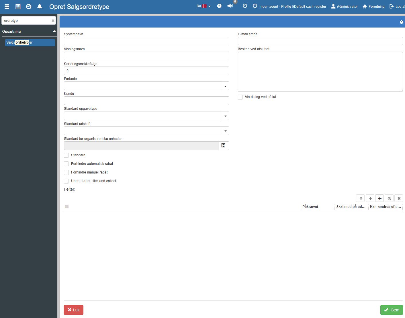 Følgende menu vil nu åbne sig, hvor du har mulighed for at oprette en ny ordretype: