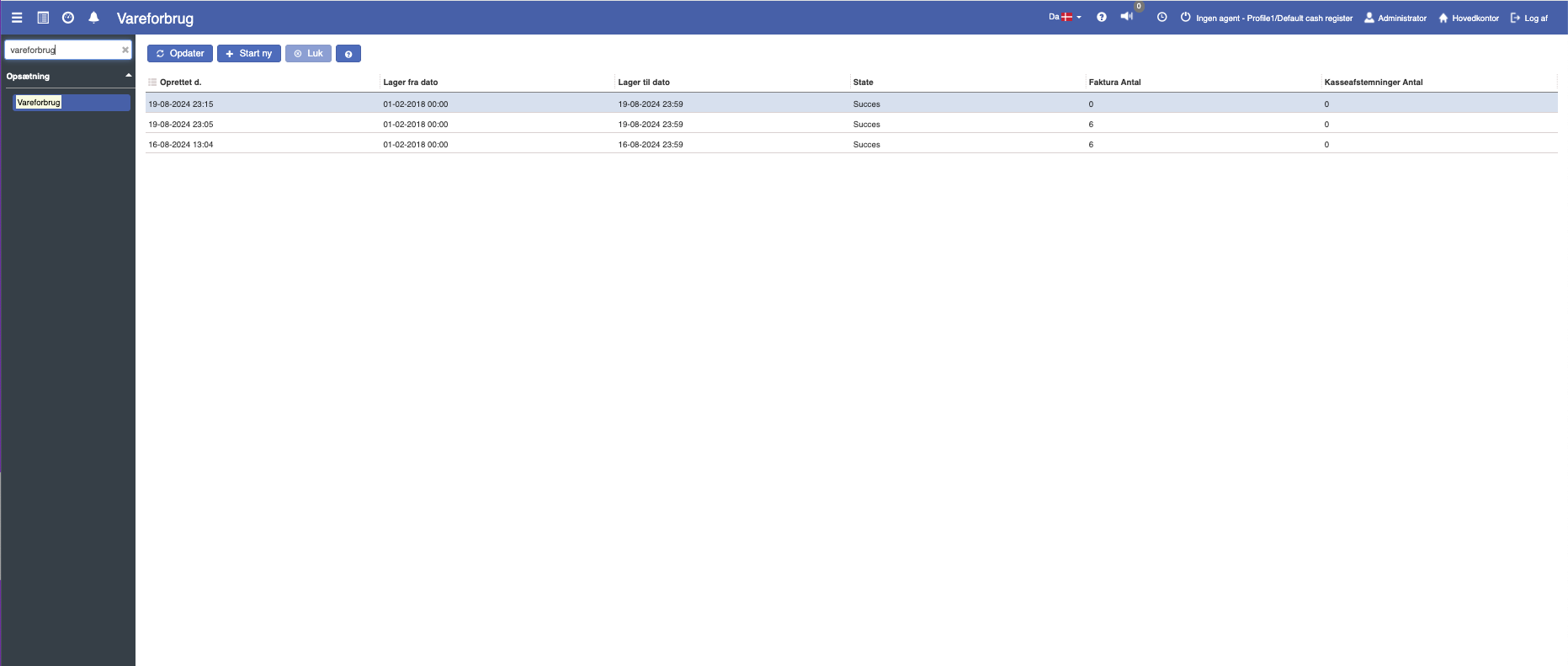 I oversigten for vareforbrug I se detaljer som oprettelsesdato, start- og slutdato for den valgte lagerperiode, status for behandlingen samt antallet af fakturaer og kasseafstemninger, der er tilknyttet perioden. Statusindikatoren, som for eksempel kan vise "Succes, " giver et hurtigt overblik over, om processen er afsluttet korrekt. Denne funktion gør det muligt for virksomheder at holde styr på, hvilke varer der er blevet brugt, og hvordan dette påvirker lagerbeholdningen og økonomien.