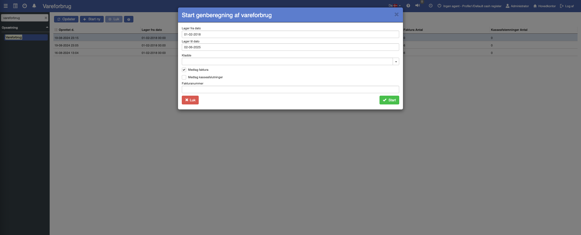 Følgende menu vil nu åbne sig, hvor du har mulighed for at starte genberegning af vareforbrug:
