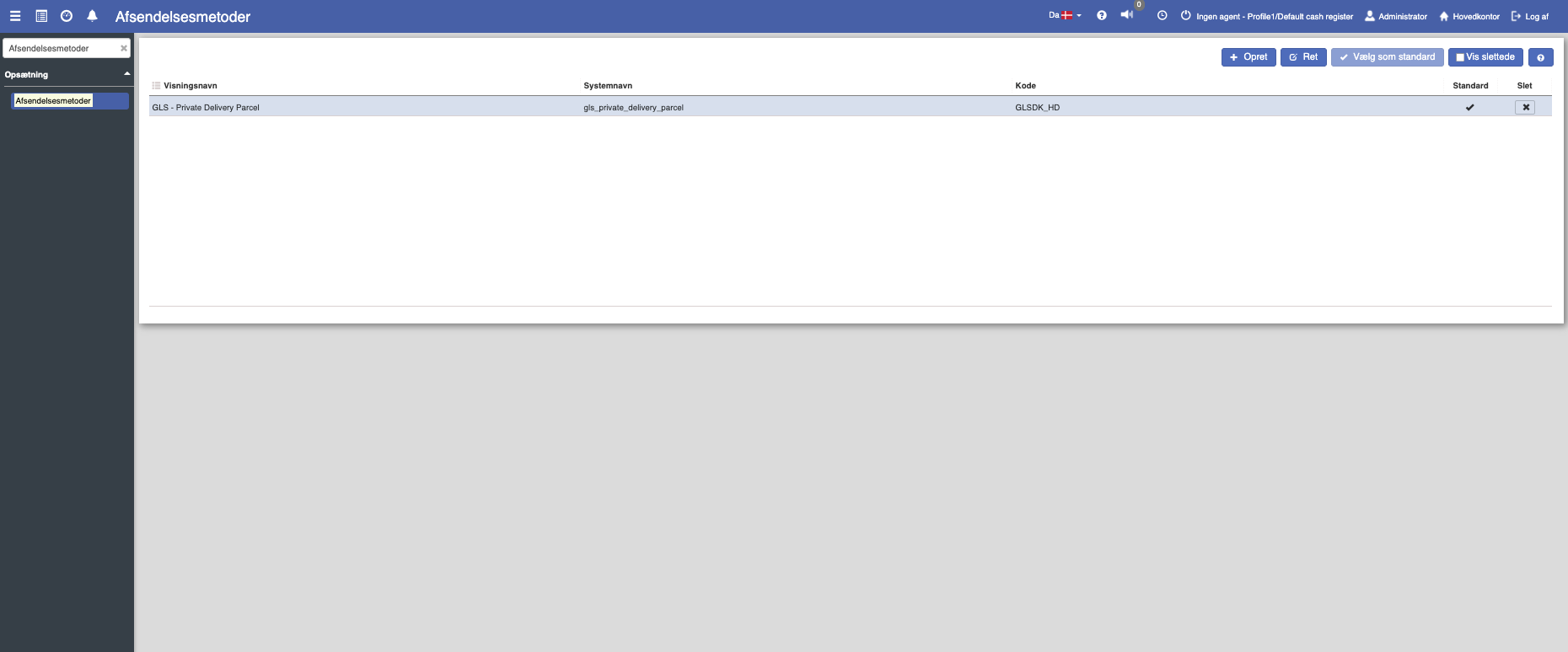 1. Fra Shop Manager tilgås "Opsætning" -> "Afsendelsesmetoder".