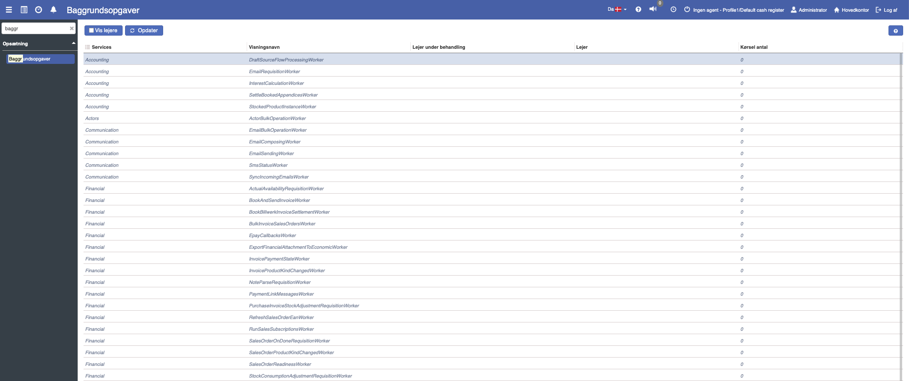I oversigten over baggrundsopgaver kan man se en liste over aktive processer, deres tilstand og hvilke tjenester de er tilknyttet. Eksempler inkluderer behandling af fakturaer, opdatering af lagerpriser, håndtering af e-mails og SMS'er samt synkronisering af data på tværs af systemet.