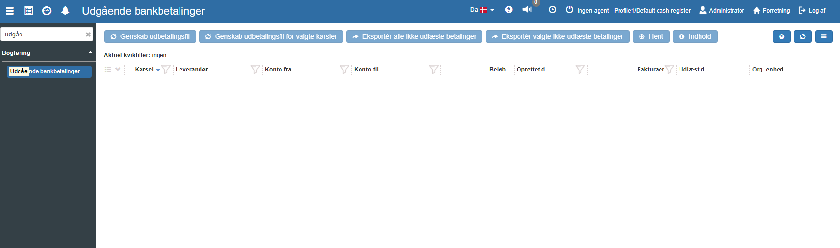 Under "Udgående bankbetalinger"-fanen har du mulighed for at administrere og håndtere udbetalinger til leverandører effektivt ved hjælp af følgende funktioner: