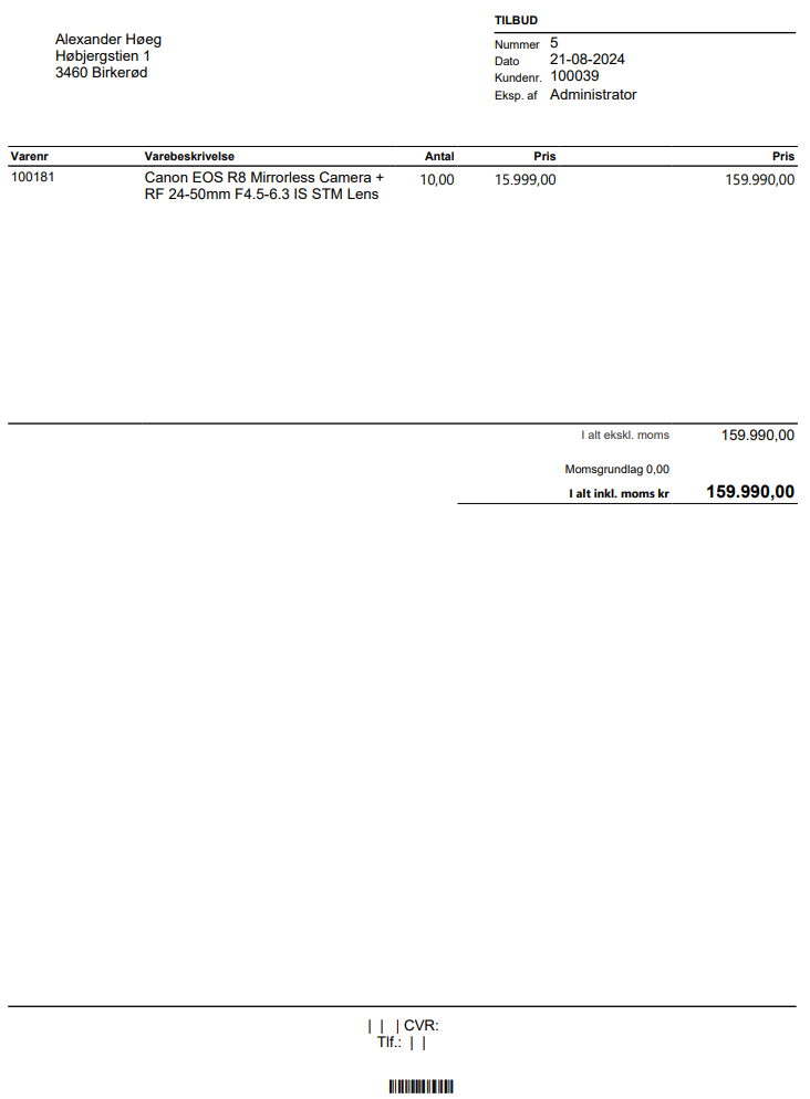 Herunder ses et eksempel på en tilbudsudskrift i PDF-format: