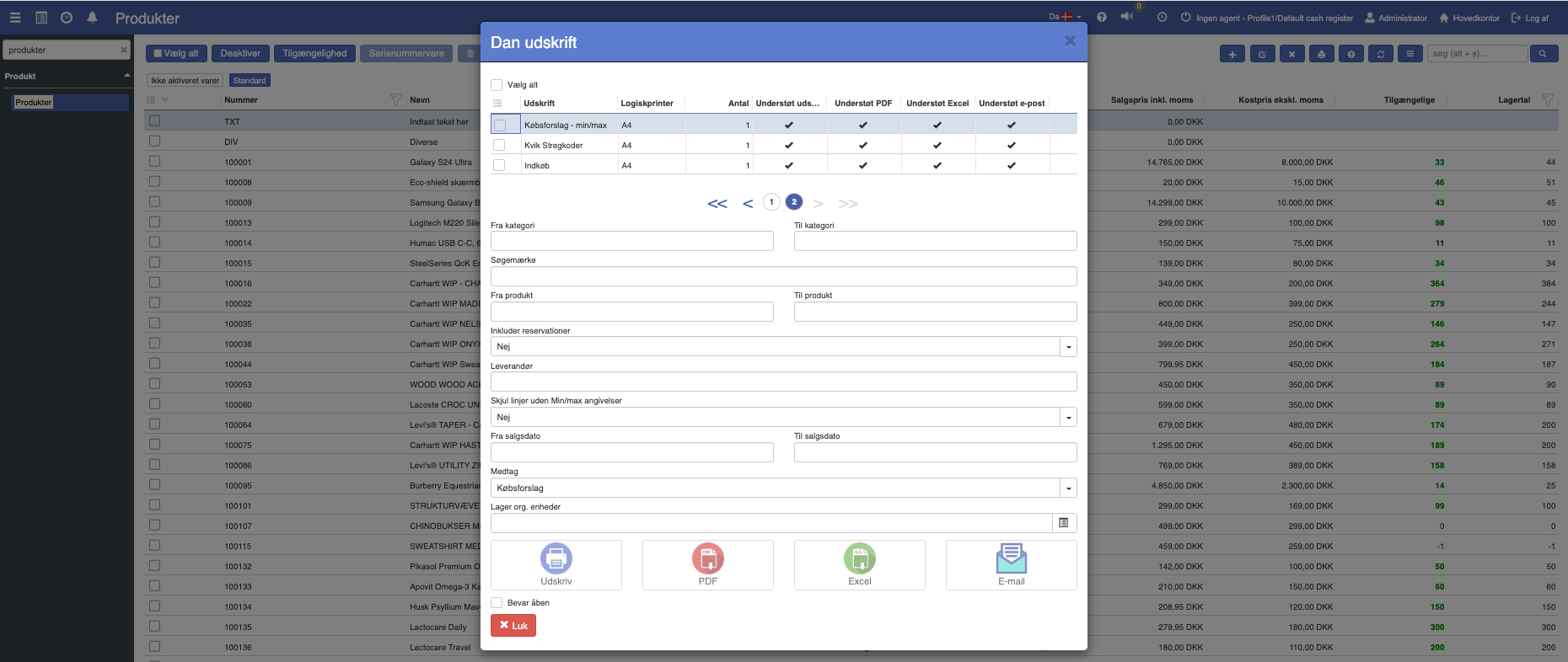 Indkøbsudskriften kan også udskrives fra topudskriftsmenuen i hovedbjælken øverst og i inkøbssektionen i Shop Manager.