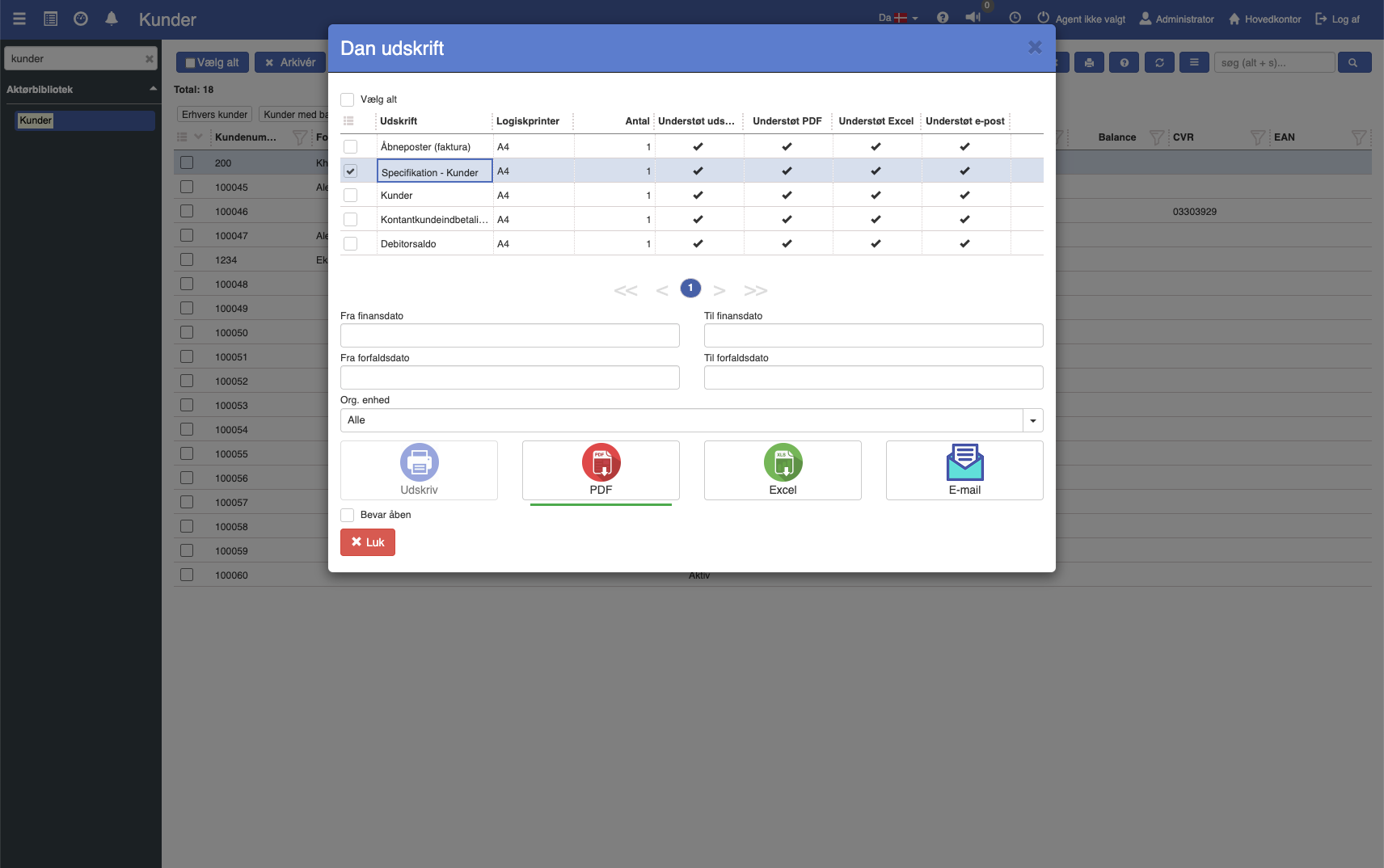 2. Fra Kunder-siden, kan du trykke på printerikonet i øverste højre hjørne.