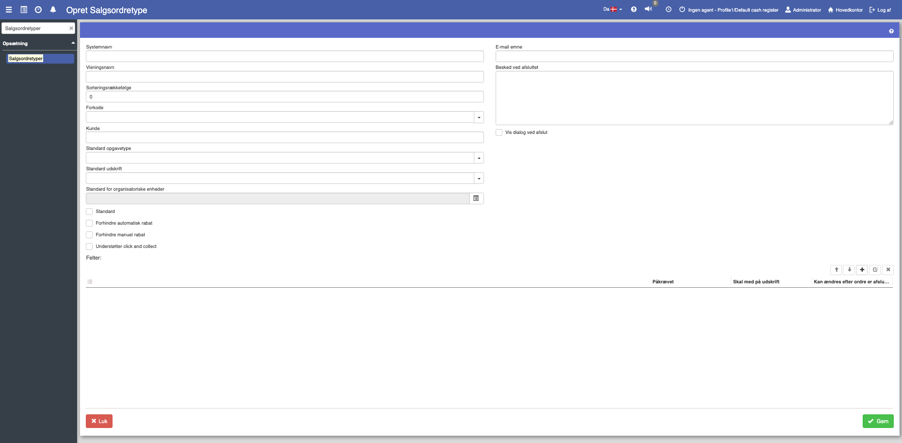 Opsætningen af salgsordretyper muliggør specialtilpasning af salgsordrer af denne type, for eksempel afsendelse af en SMS ved afslutning af salgsordren. Der kan også vælges, hvilke dynamiske felter der skal være tilgængelige for netop denne salgsordretype. På denne side gennemgås de forskellige muligheder.