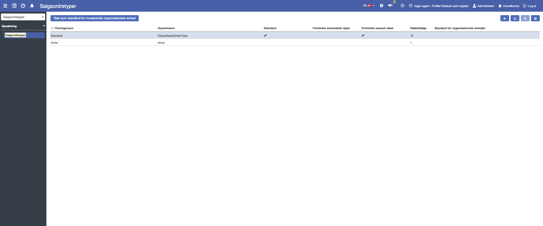 Sorteringsrækkefølge: Angiver den ønskede visningsrækkefølge for salgsordretyper i en dropdown-menu på salgsordreskærmbilledet.