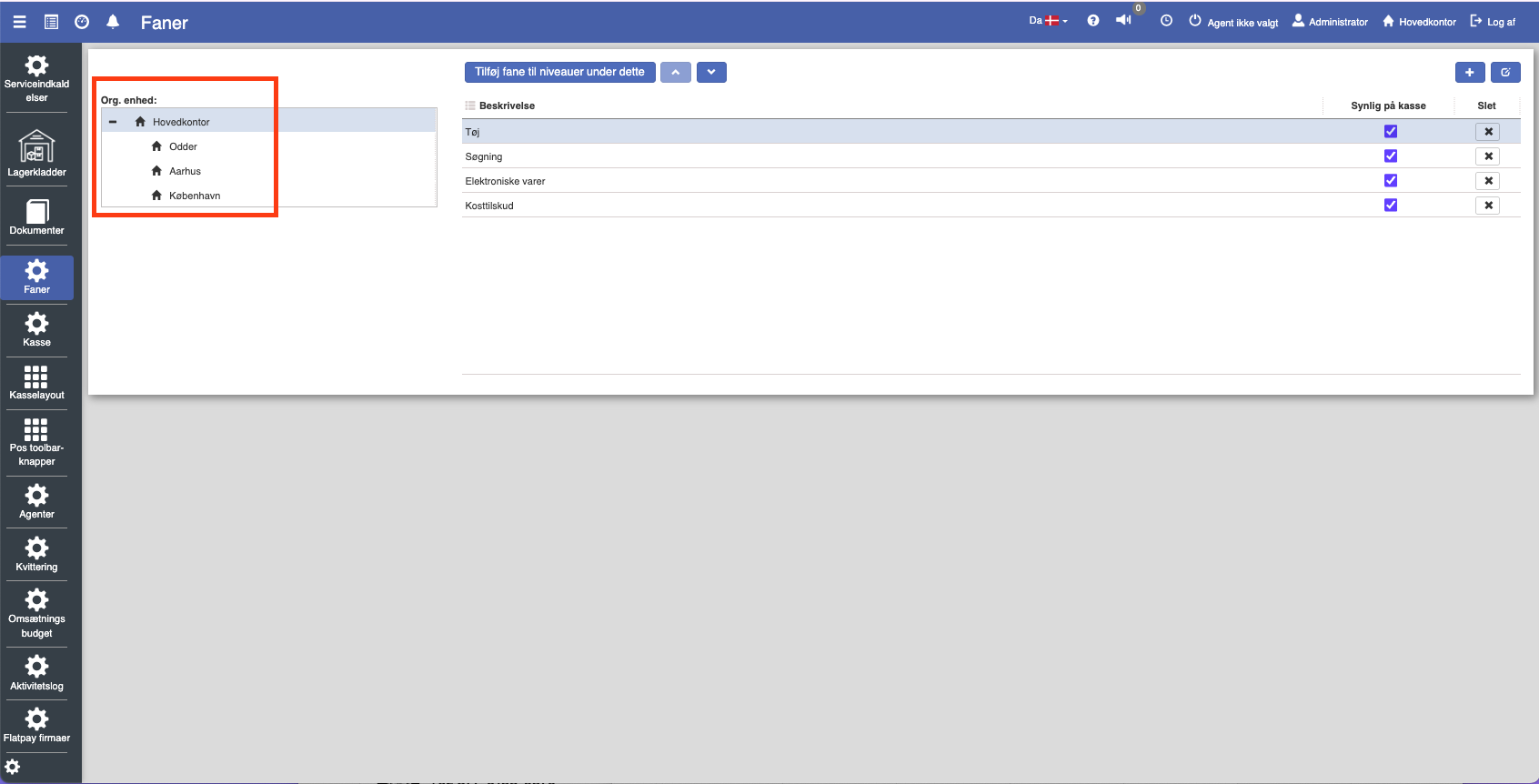 Som nævnt tidligere kan man ændre kasselayoutet for den enkelte organisatoriske enhed (afdelinger). Du kan vælge den specifikke afdeling ved at klikke på den i venstre side (se billede).