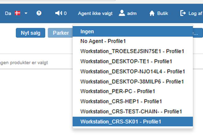 Brugeren i kassen skal være koblet sammen med CRS agenten så derfor er det vigtigt at vælge den profil på Sapera der har samme navn som CRS Agenten. I dette eksempel ”Workstation_CRS-SK01 – Profile1”