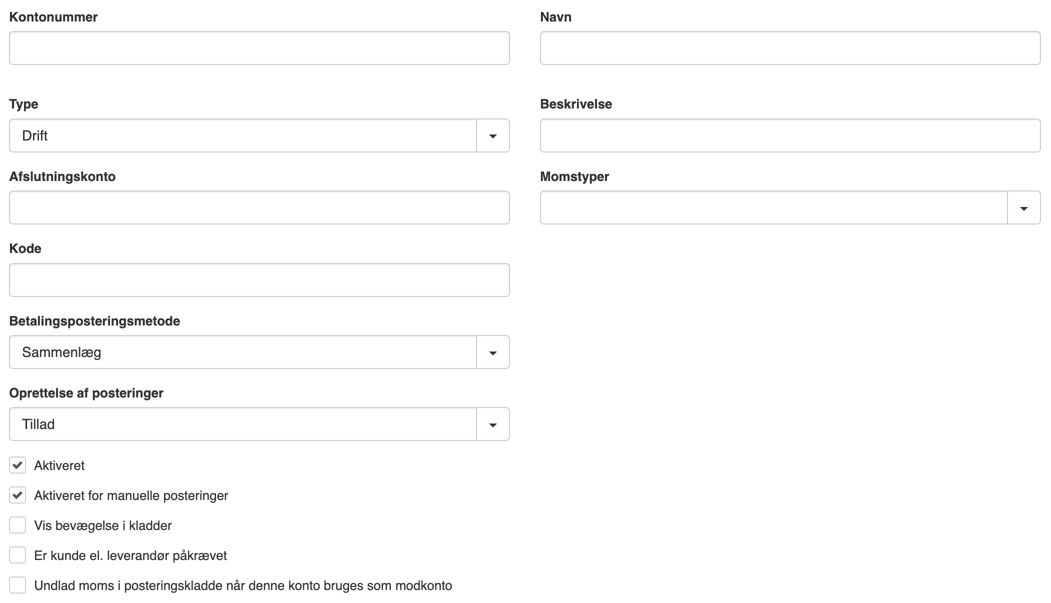 OBS hvis du ikke kan finde “Kontoplan“, skyldes det, at du mangler at få rettigheder til det. I dette tilfælde kan du kontakte supporten for at få adgang.