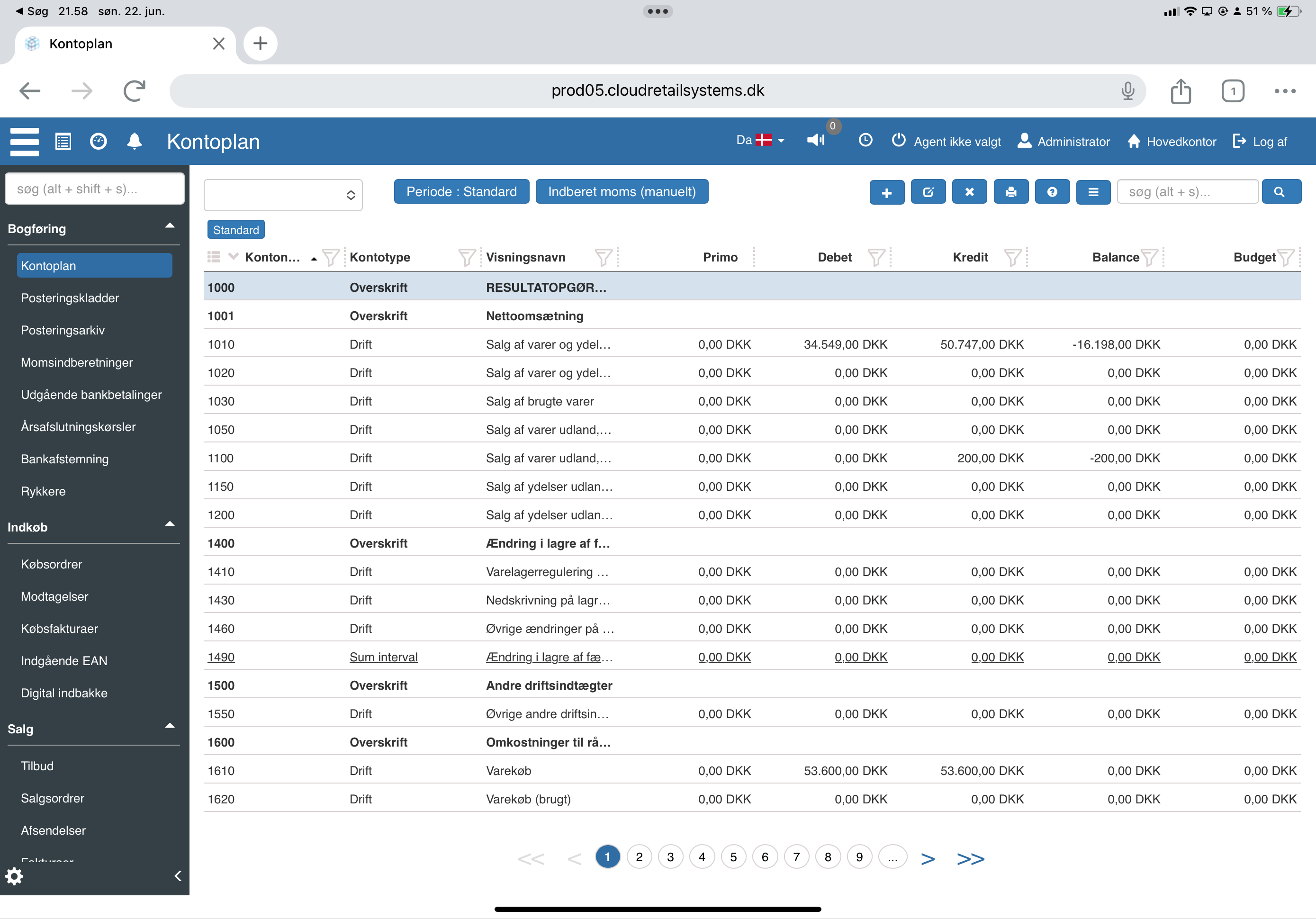 Kontoplan-skærmen giver dig et samlet overblik over virksomhedens finanskonti og deres bevægelser. Her vises hver kontos type, visningsnavn samt tal for primo, debet, kredit, balance og budget. Skærmen bruges typisk til at analysere og kontrollere regnskabsposter samt sikre korrekt bogføring i forhold til virksomhedens økonomiske struktur.