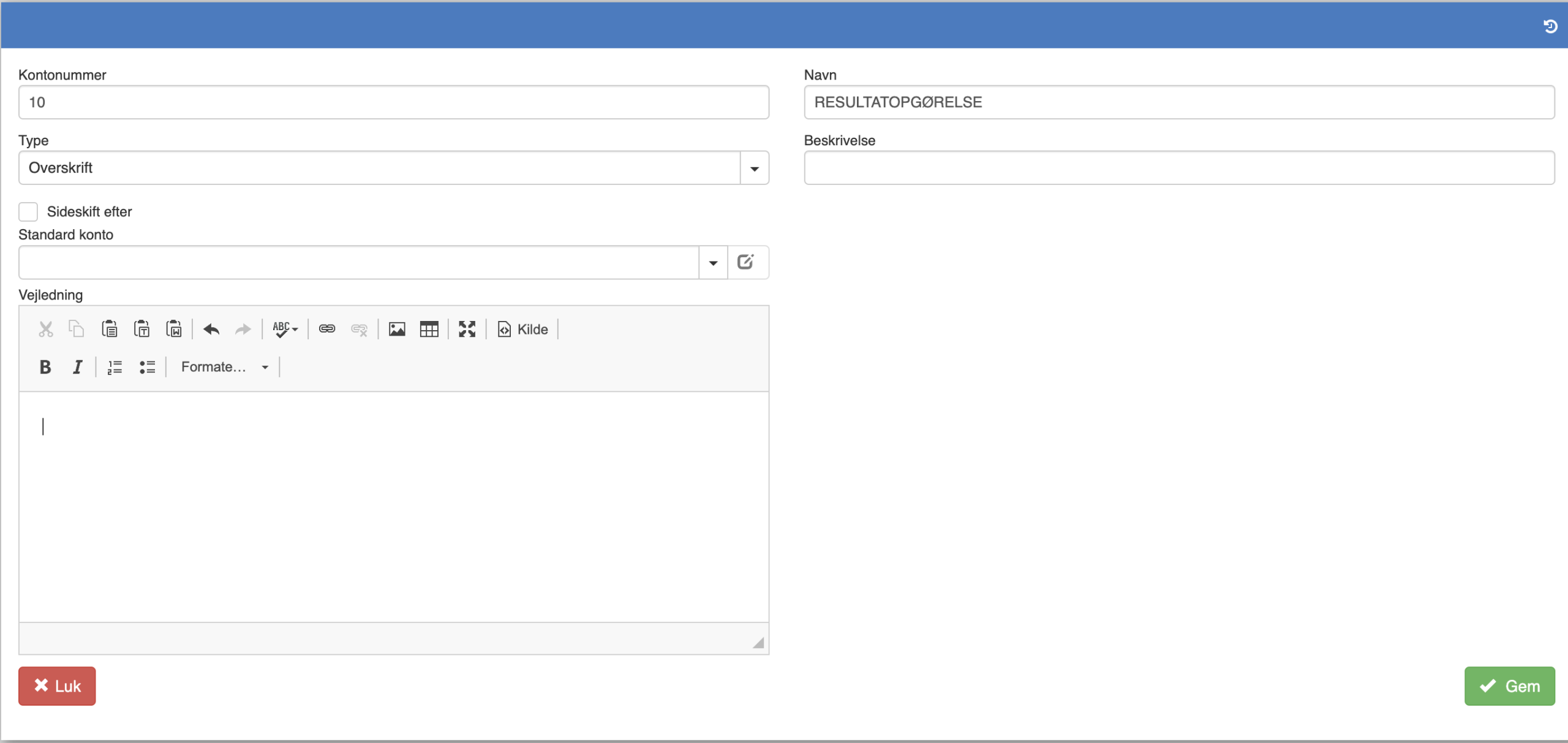 Standardkonto: Her bør der mappes til en konto fra standardkontoplanen. Dette skal gøres, før Sapera kan udlæse i SAF-T-format. Derudover vil posteringskladden ved valg af konto kunne vise vejledning fra standardkontoen, også selvom der ikke er skrevet en vejledning for denne konto.