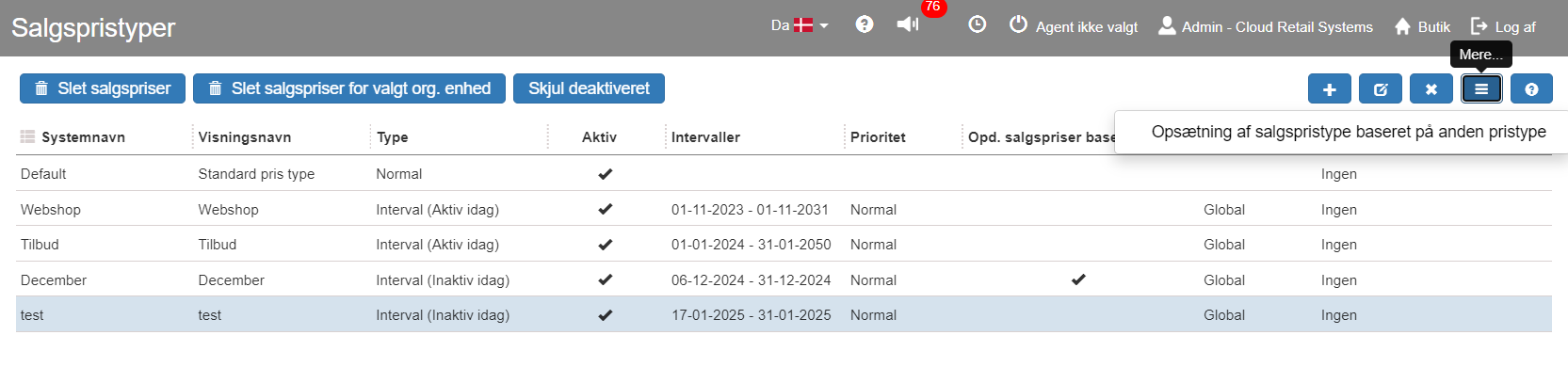 Når du har udfyldt salgspris intervallet og klikket på “Gem”, kan du se den nye pristype ude på forsiden. Vælg den og klik på “Mere”, som er de 3 streger oppe i højre hjørne, og vælg derefter “Opsætning af salgspristype baseret på anden pristype”