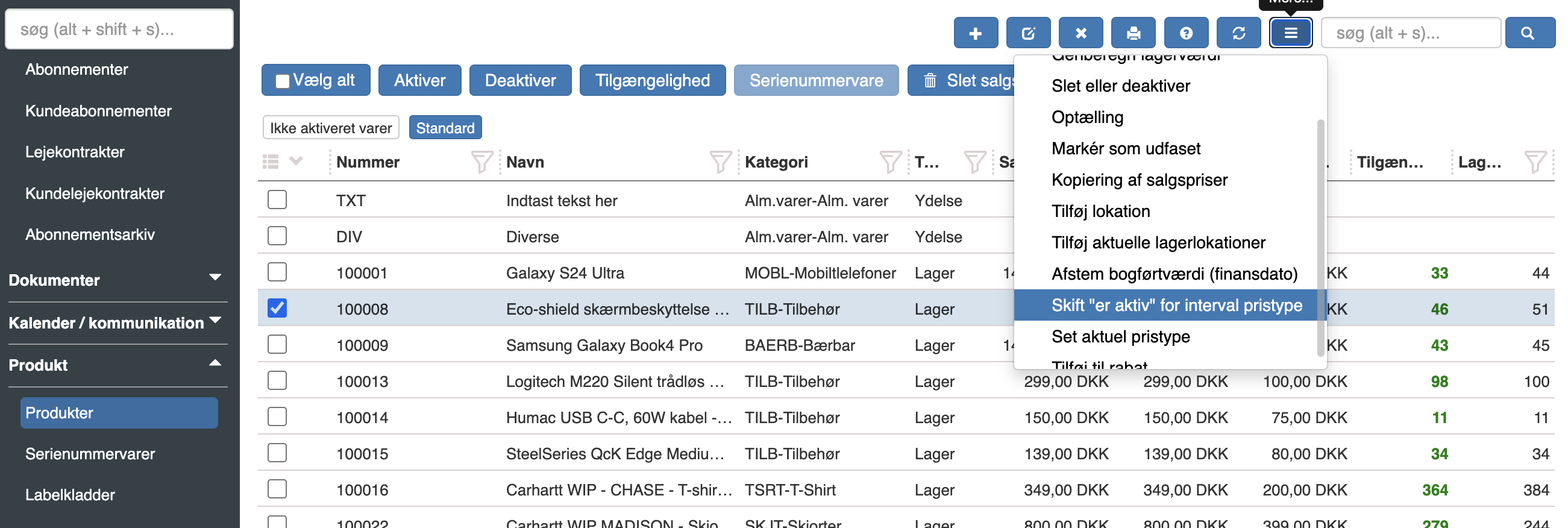 Vælg de ønskede produkter og tryk på “Mere”-knappen → “Skift “er aktiv” for interval pristype”