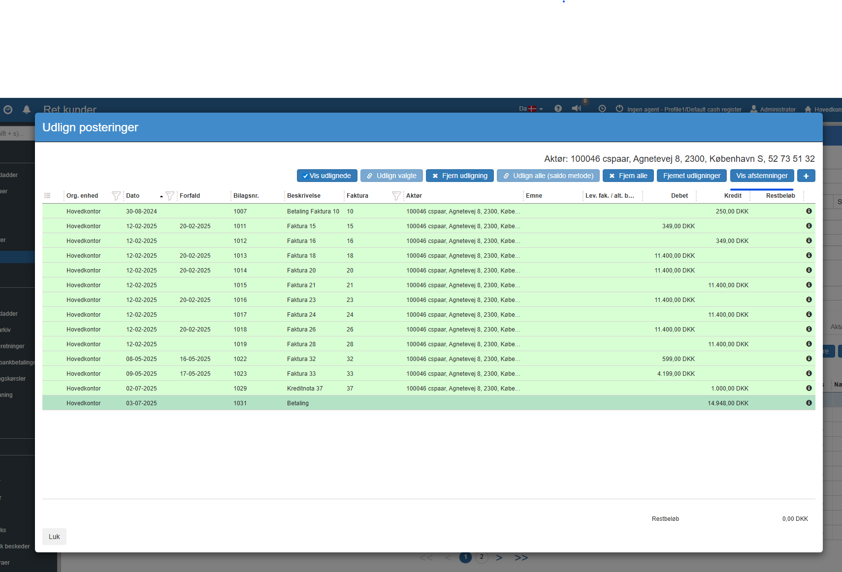 Restbeløbet opdateres nu med det samme efter man har lukket udligningsvinduet.
