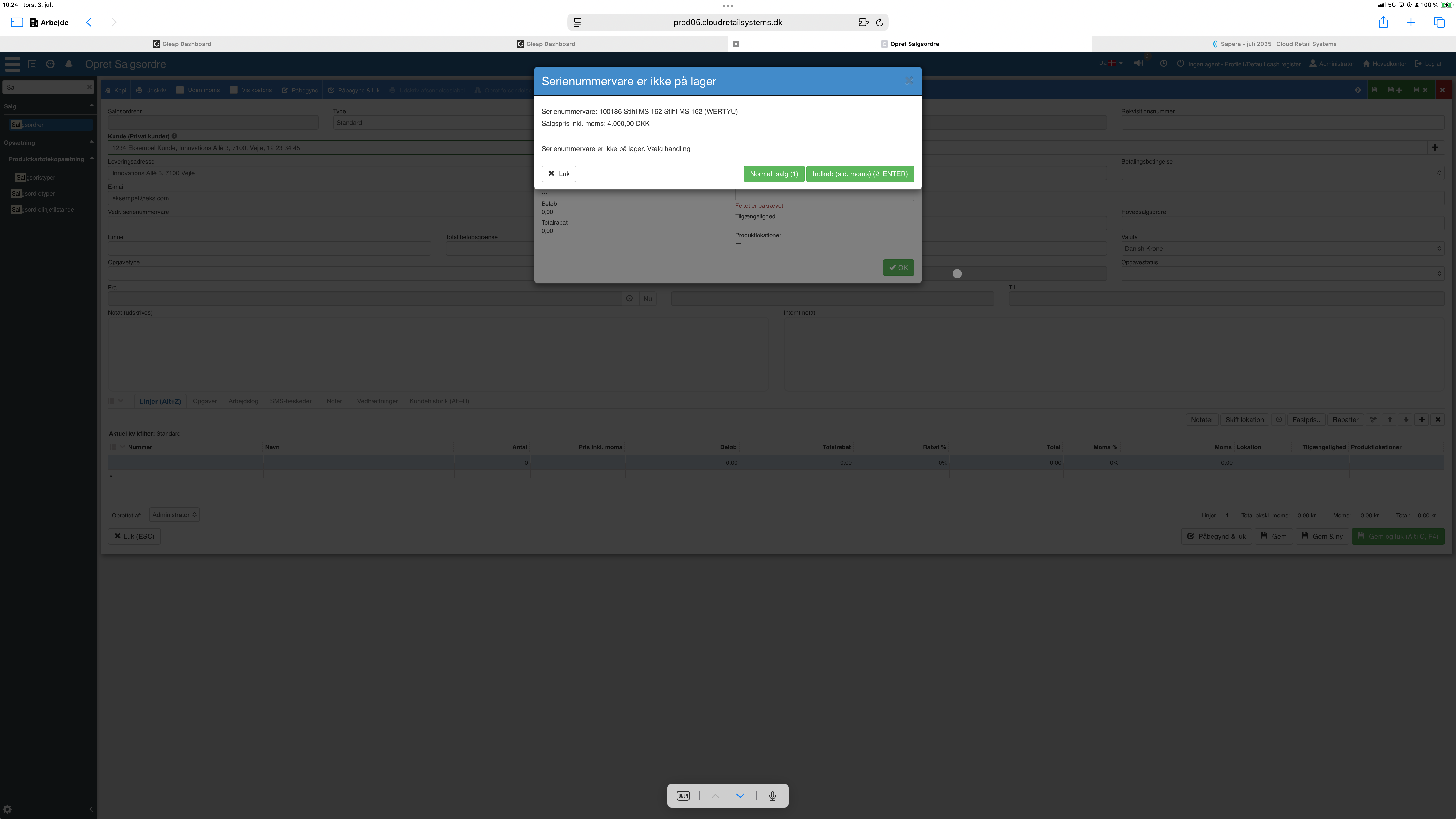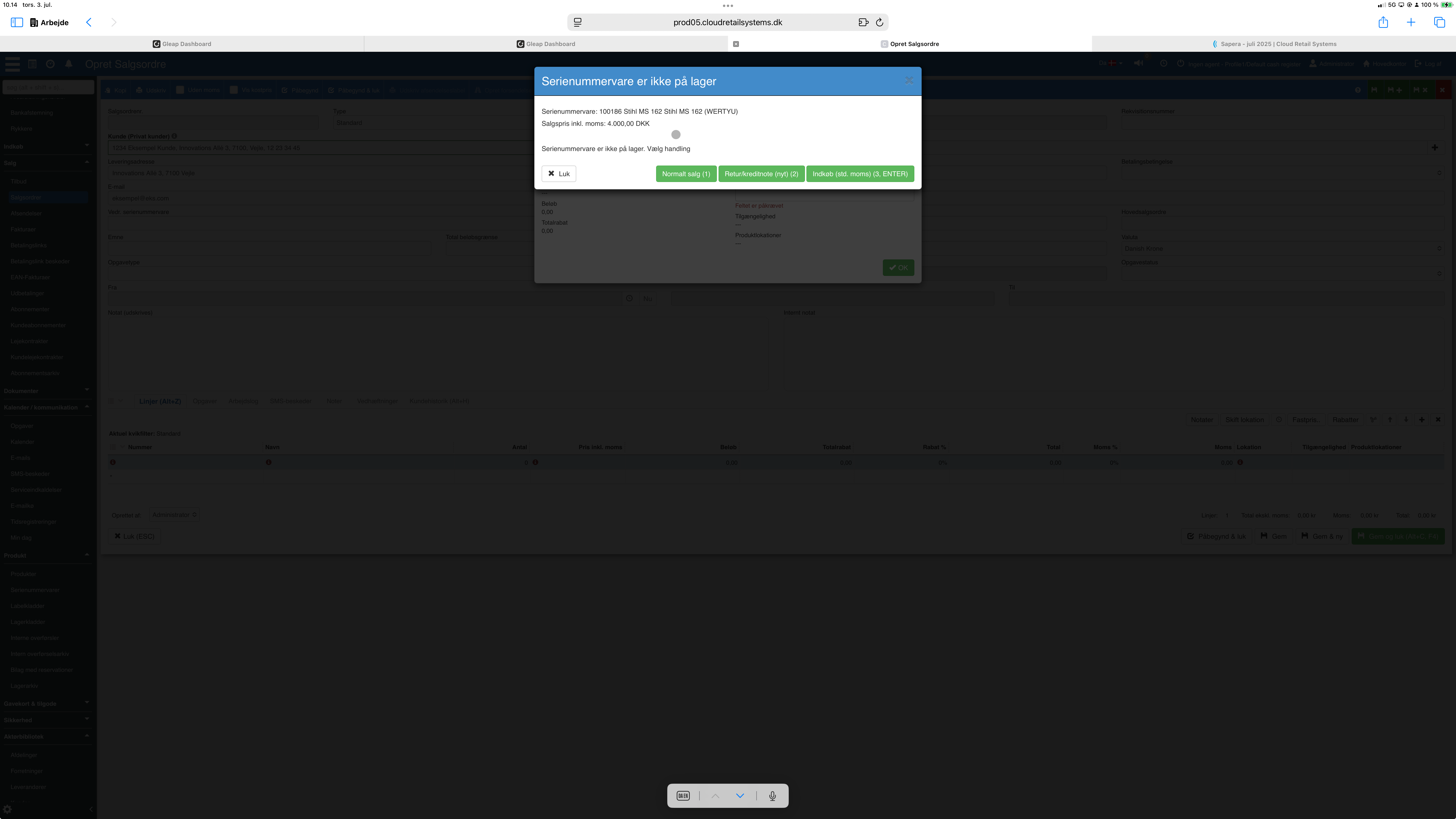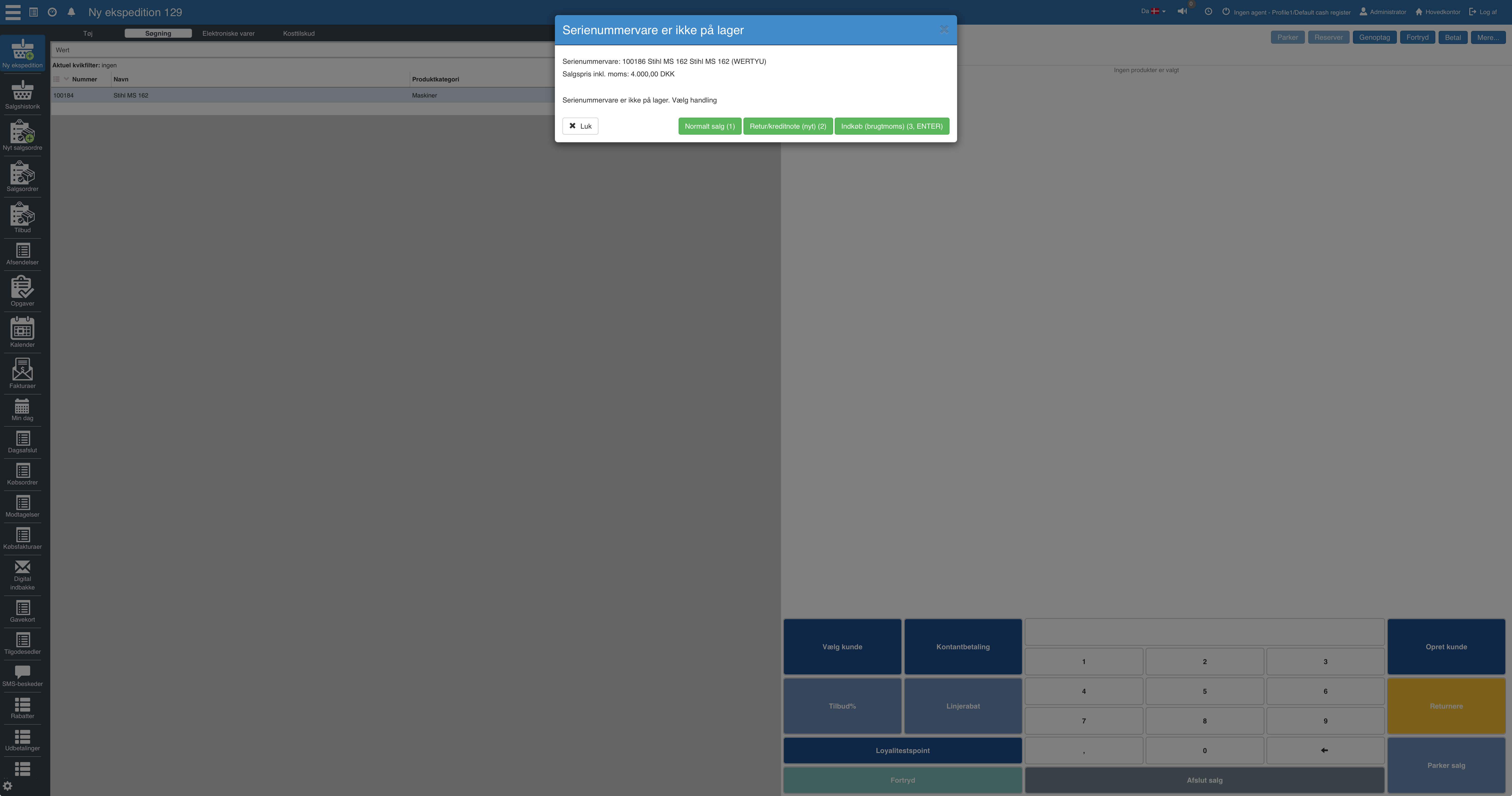 Dialogen for salgsordre ved tilføjelse af en serienummervare, der ikke er på lager, er ændret, så ‘Indkøb (Brugtmoms)’ ikke er en mulighed, hvis indstillingen er slået fra.