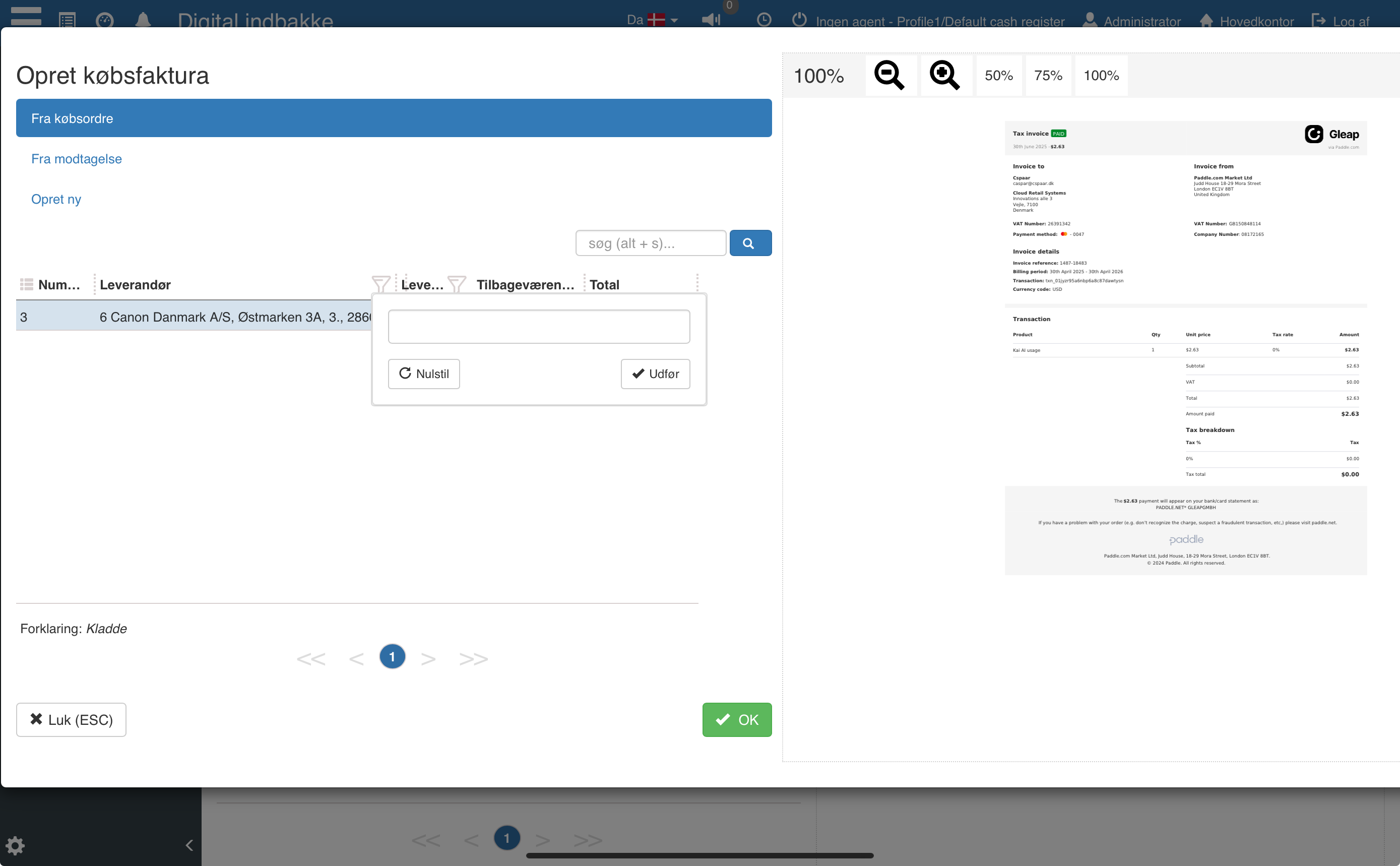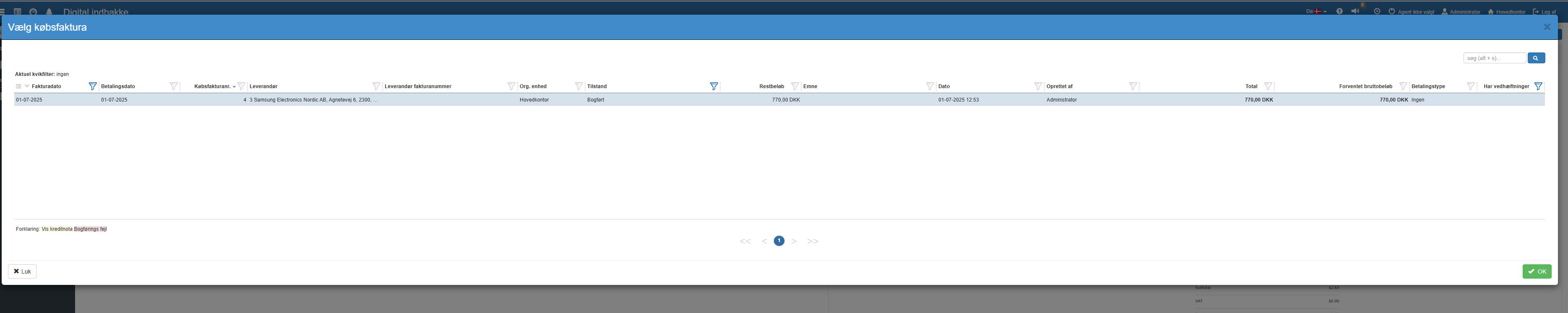 Ved oprettelse af købsfaktura fra modtagelse / købsordre er det nu muligt at filtrere på leverandør. På den måde kan man bruge den digitale indbakke til at sende alle bilag manuelt til indbakken og filtrere ved oprettelse, for at finde modtagelsen / ordren fra den pågældende leverandør.