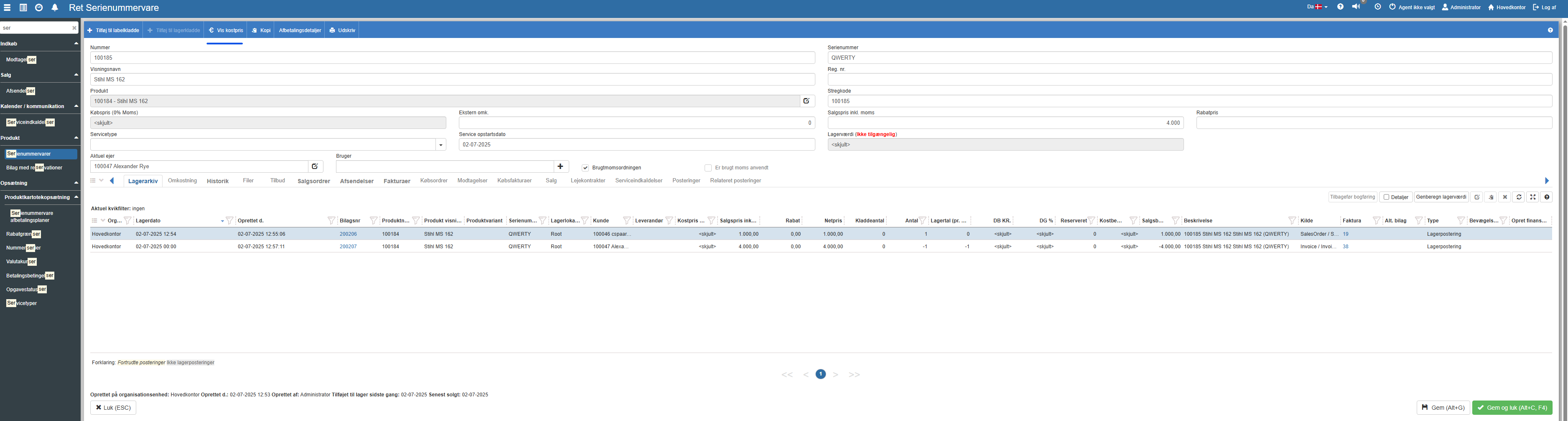 Derfor findes der nu 2 felter på serienummervarekortet. “Er brugt” og “Brugtmomsordning”.