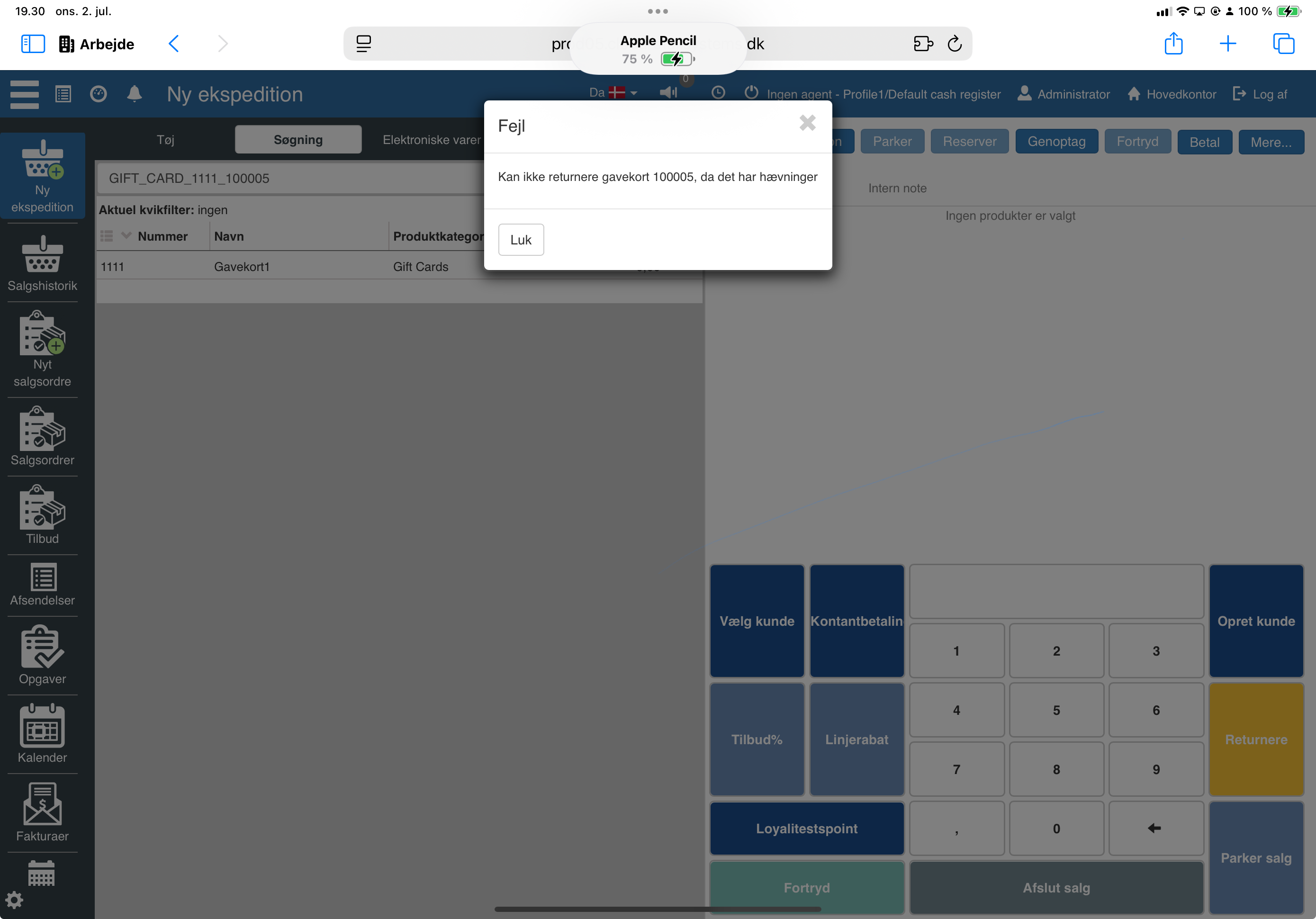Forhindrer returnering af gavekort, hvor der allerede er foretaget hævninger.