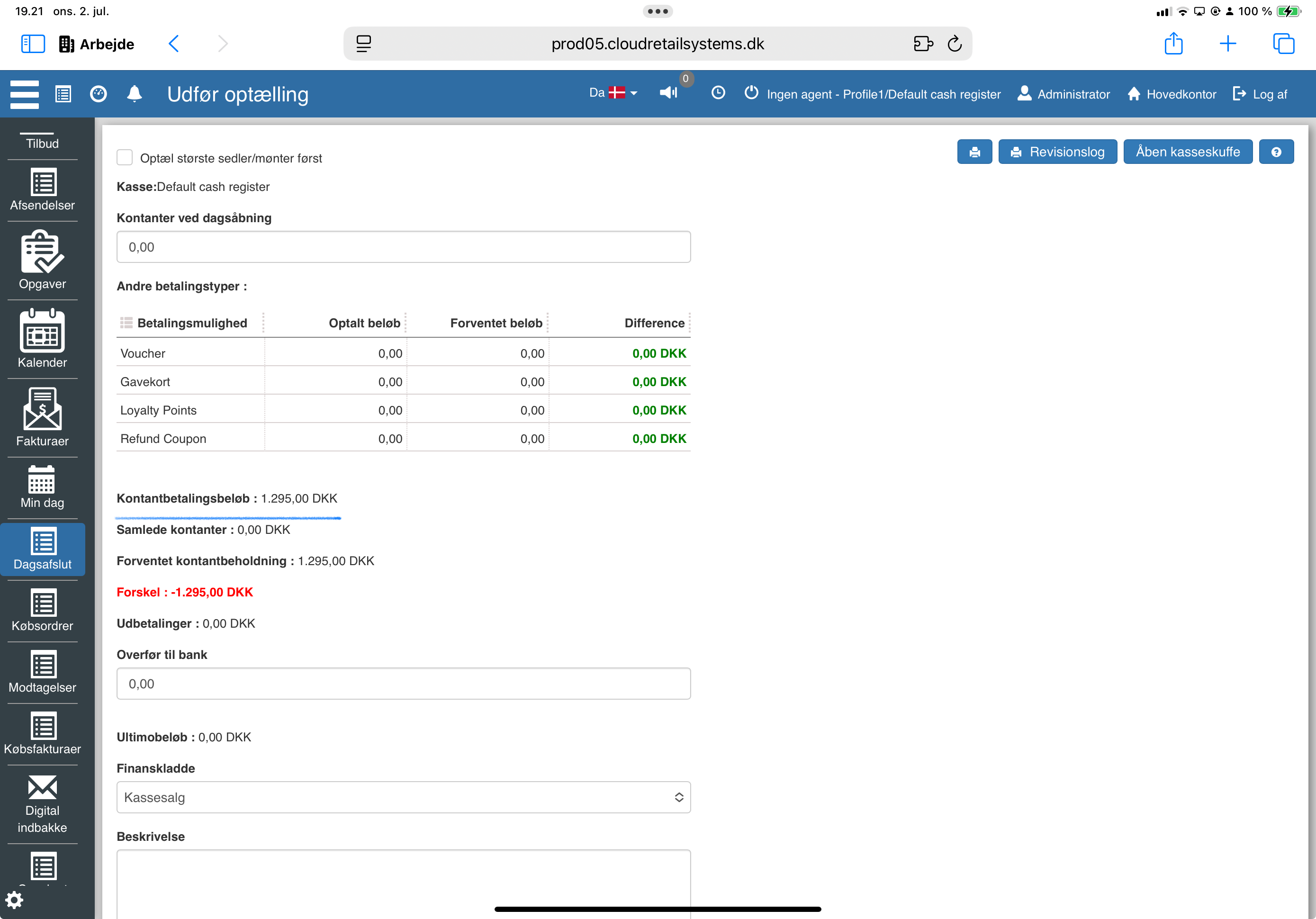 Beløbet vises nederst i dagsafslutningsoversigten og summerer alle kontante salg siden sidste dagsafslutning.