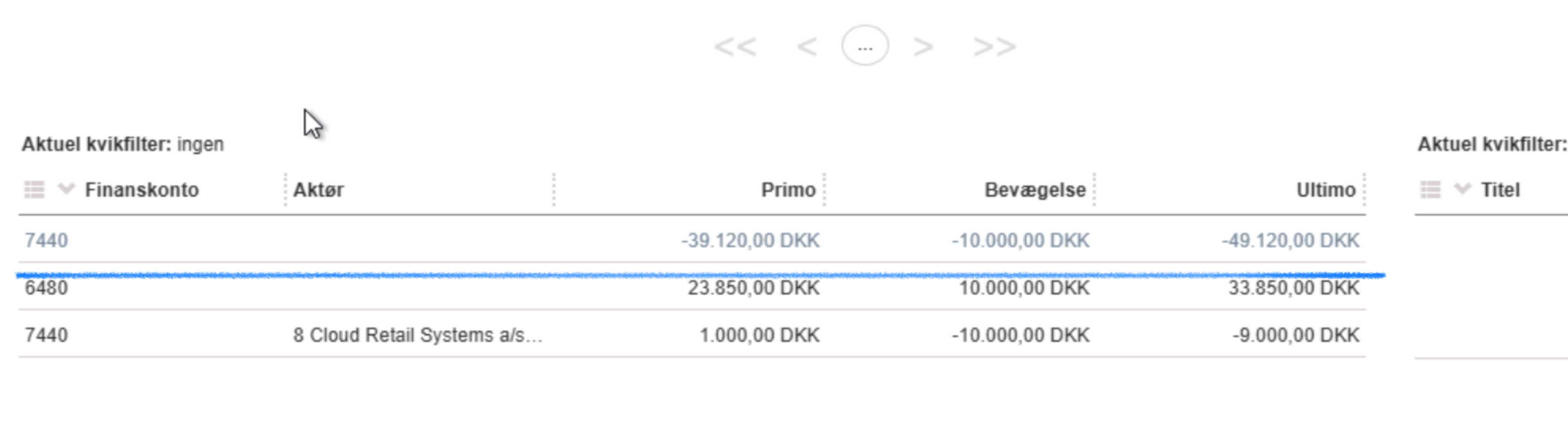 Hvis man vælger at se posteringer grupperet pr. aktør, så vises den reelle postering med normal skrift, og bevægelser uden aktør vises med grå skrift. Det vil sige det er muligt at se de samlede bevægelser på, (i dette tilfælde) konto 7440, selv hvis der var flere posteringer for forskellige aktører.