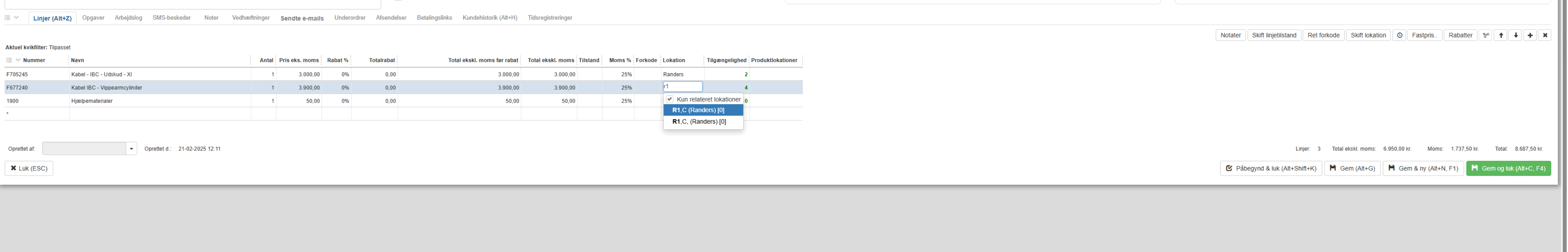 Den lokation varen skal sælges fra - kan nu vælges direkte fra linjen. Lokationer skal være tilknyttet samme lager men ikke nødvendigvis samme Organisatoriske enhed.