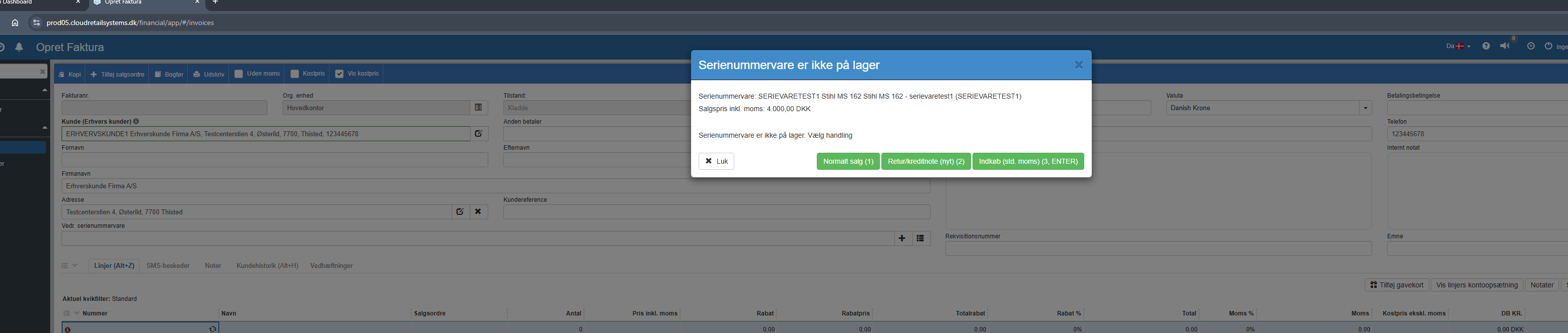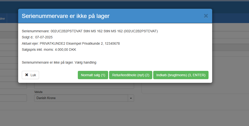 Når man sætter en serievare på en salgsordrelinje / fakturalinje og denne ikke er på lager, vises dette skærmbillede.