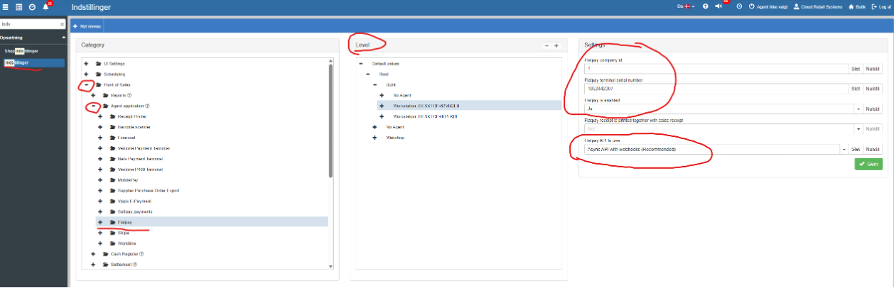 - Gør herefter som vist på billedet nedenfor - HUSK under “Level” at vælge den agent (PC-navn) som tilhører kassen.