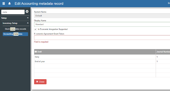 - Gå til listen “Regnskab/Integration” og åbn den relevante metadata-post til redigering.