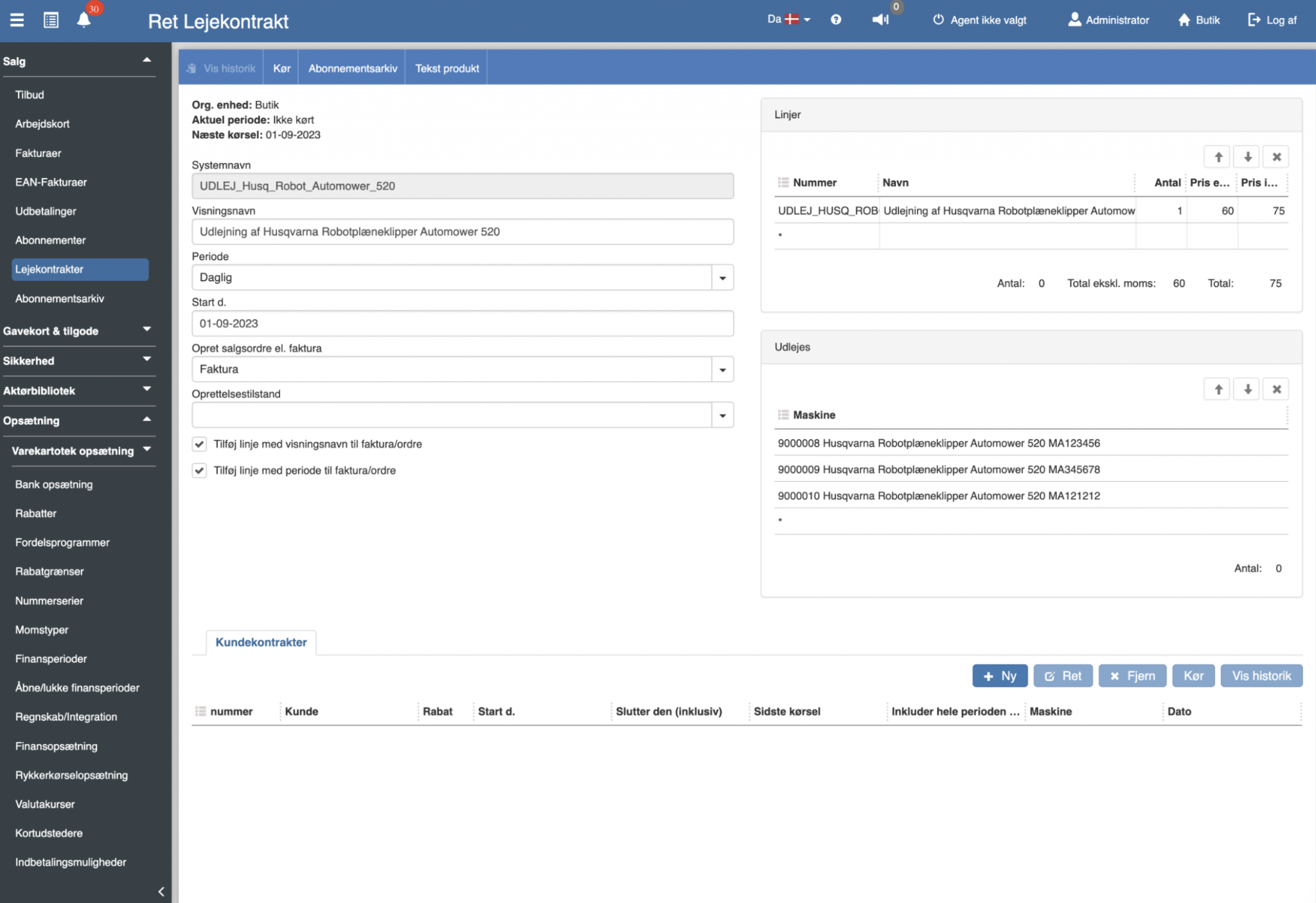 Sapera understøtter nu udlejning. Lejekontraktstyring giver en metode til at opkræve for udlejning af serienummervarer. Det er vigtigt at bemærke, at lejekontraktmodulet er en ekstra mulighed, som kan tilkøbes i Saperaløsningen. Hvis dette vækker interesse, er man velkommen til at kontakte salgsafdelingen. Læs mere om udlejning her.