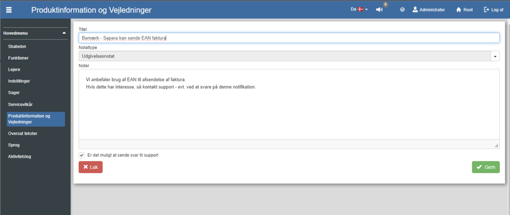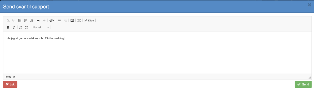 Opsætning af disse notifikationer med svarmulighed er som normale notifikationer – dog afkrydses “Er det muligt at sende svar til support”