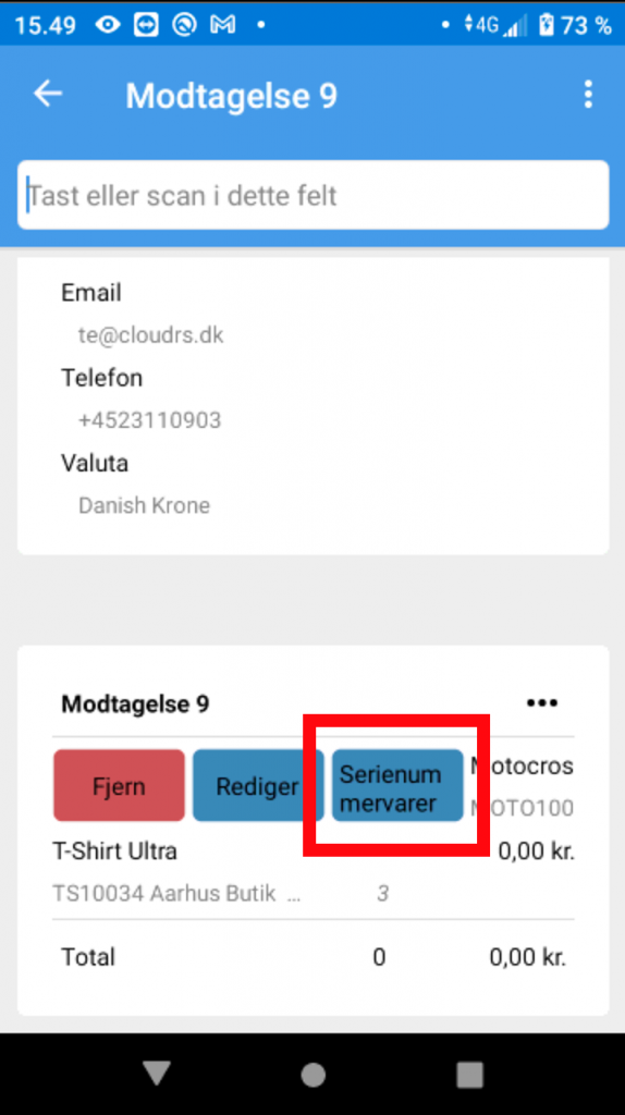 Ved skanning sættes serienummeret som udgangspunkt til det sammme som stregkoden. Man kan ændre dette ved at swipe og trykke “Åben”