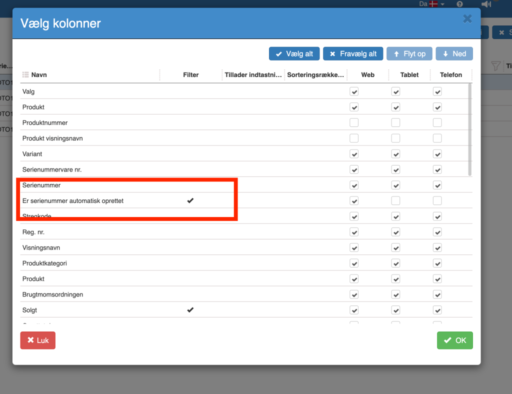 Hvis man senere ønsker at udfylde serienumre på serievarer, hvor serienummer er udfyldt automatisk kan dette evt. køres fra Sapera ved valgt af kolonnefilter “Er serienummer automatisk oprettet”