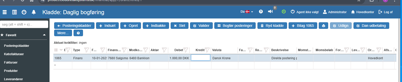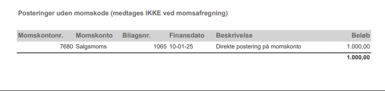Hvis du manuelt bogfører f.eks. 1.000 kr. på en udgående salgskonto med banken som modkonto, oguden at angive momstype, vises posteringen i sektionen Posteringer uden momskode.